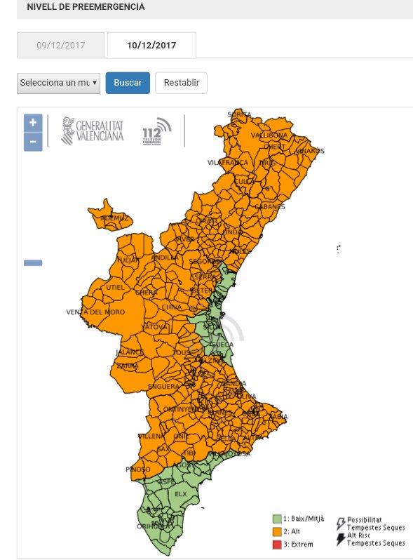 Los servicios de emergencia aconsejan no hacer ningún fuego en zona forestal, debido a la fuertes rachas que se esperan y a las escasas precipitaciones que tenderán a disminuir de Oeste a Este en la Península a partir del Lunes. El nivel de pre-emergencia por riesgo de Incendios Forestales es alto en casi toda la Comunidad Valenciana, especialmente en la zona Norte