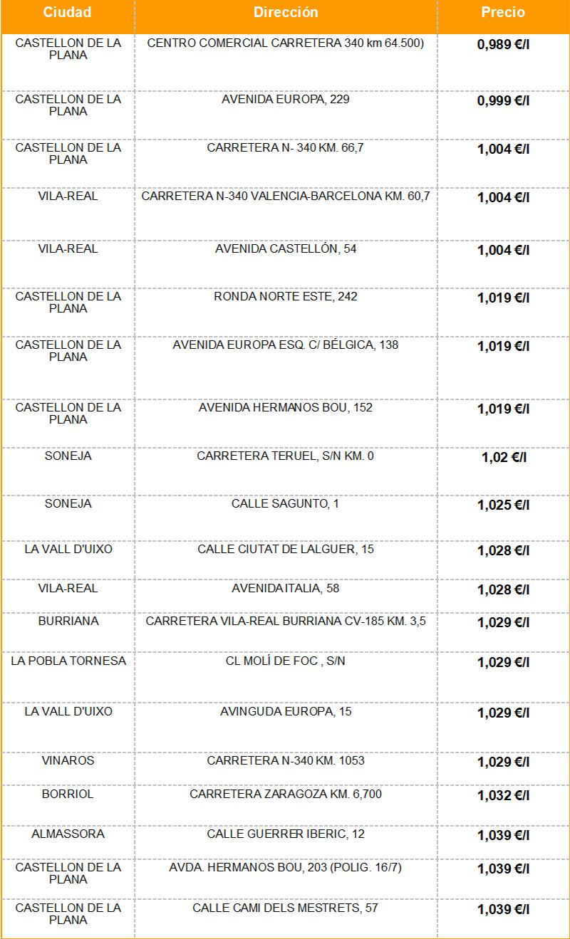 Ranking de las 20 gasolineras con el gasoil más barato de la provincia de Castellón (diferencia entre 0,98 y 1,03 €/l)