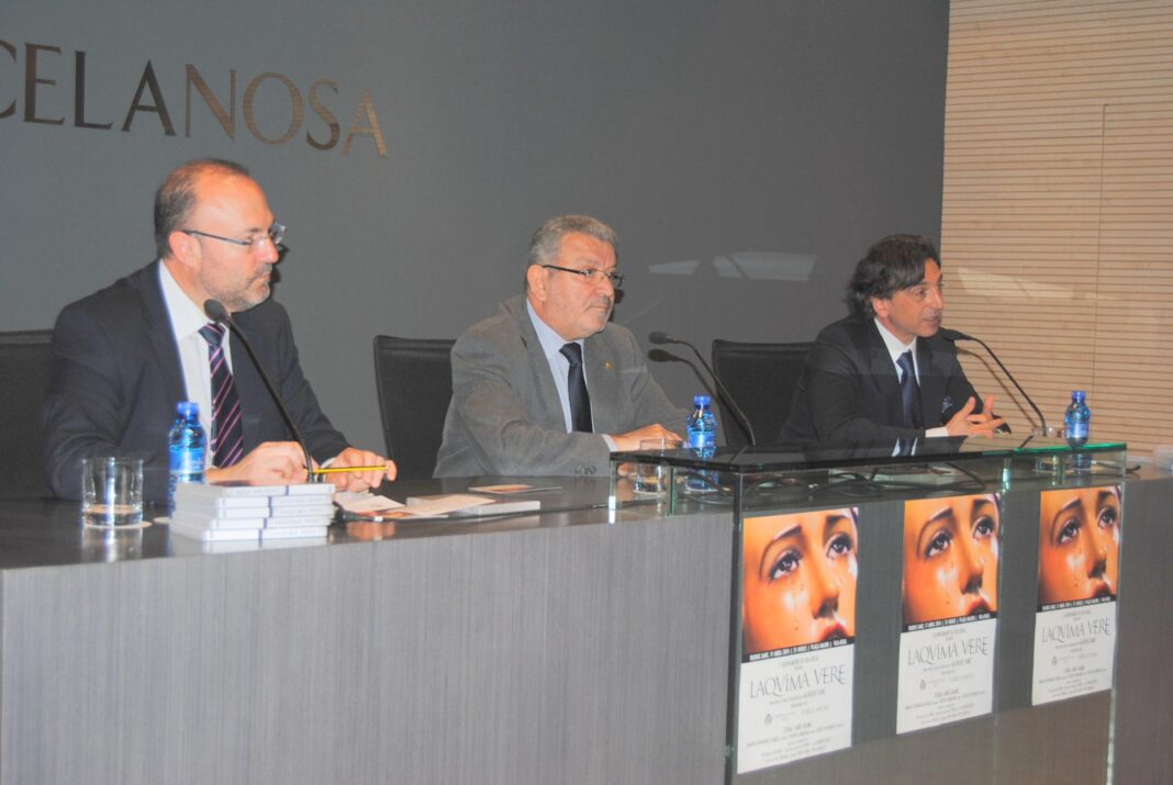 Alfredo Sanz, director y escritor de Laqvima Vere, Emilio Obiol, concejal de Turismo, y Pasqual Batalla, concejal de Tradiciones, han presentado esta mañana en las instalaciones de Porcelanosa Grupo, patrocinador del evento, la segunda edición del espectáculo Laqvima Vere, que cuenta con música y escena la pasión de Cristo, y que se representará el próximo jueves 17 de abril a las 21 horas en la Plaza Mayor de Vila-real. Según Obiol, "un acto que une vanguardia y tradición, innovador y diferente".