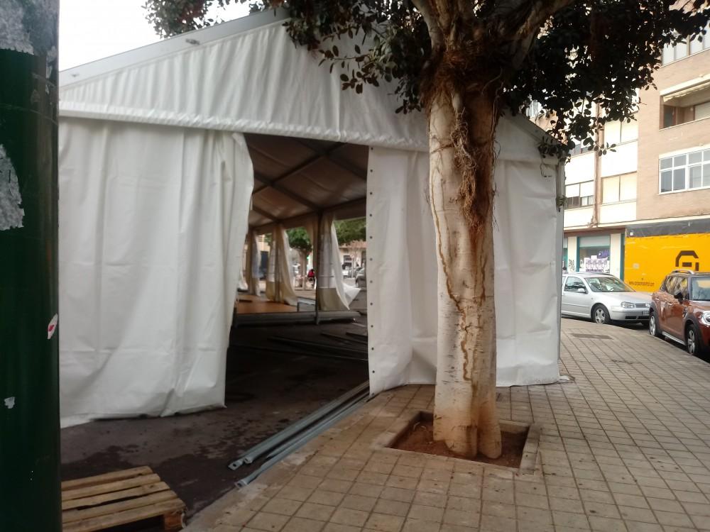 El solar de las 'mascletaes' está listo y los operarios están terminando de instalar las carpas, vallas y señales de tráfico que inundarán las calles