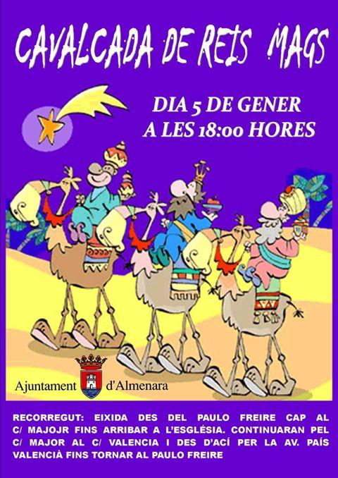 Així per segon any consecutiu els reis recorreran la localitat a cavall partint del Centre Municipal de Cultura Paulo Freire passant pel carrer Major fins a arribar a l'Església on seran rebuts. A partir d'ací, la comitiva seguirà per l'avinguda País Valencià fins a arribar de nou al Centre Paulo Freire on les seues majestats procediran al lliurament de regals als xiquets i xiquetes de la localitat. Cardona ha destacat que en la cavalcada participarà l'Associació Cultural Recull, els Quintos 2017, els Quintos dels 25 anys i l'Associació Musical Santa Cecília d'Almenara als qui agraeix la seua participació.
