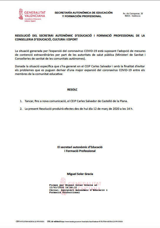 Educacion cierrre Carlos Salvador 120320El Secretari Autonòmic d'Educació i Formació Professional,  depenent de la Conselleria d'Educació, Cultura i Esport, Miquel Soler, ha emés un comunicat dirigit al col·legi Carles Salvador pel qual suspén les classes d'aquest centre per tal d'evitar la propagació del coronavirus Covid-19.