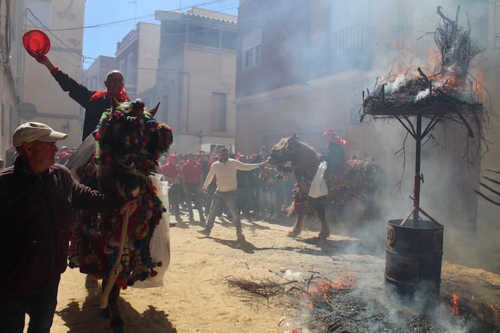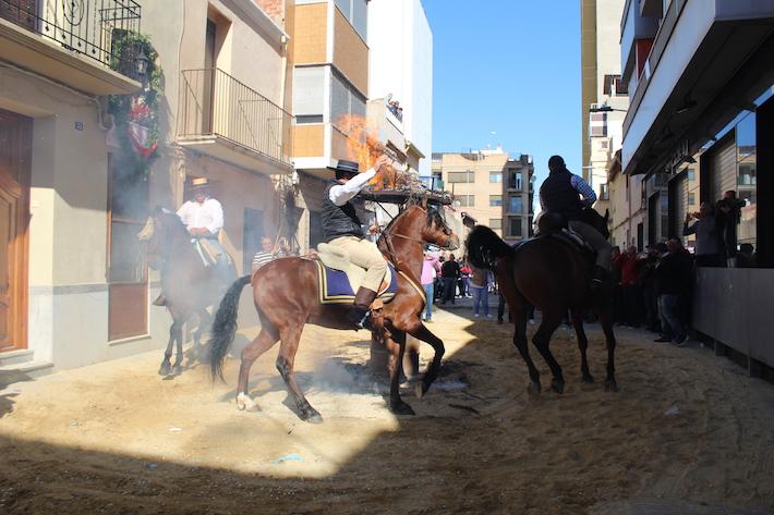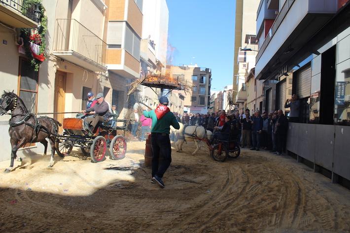La música i els carros engalanats amb cavalls han recorregut diferents carrers del casc urbà per a arribar al carrer Sant Vicent on han rendit tribut al sant rodant la foguera.