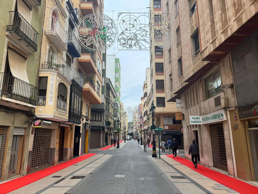 Las calles del centro de Castelló se preparan para recibir la Navidad con una decoración de lo más festiva. Y es que los principales viales comerciales de la ciudad se han enmoquetado este domingo con una alfombra roja de cuatro kilómetros, una iniciativa impulsada por la Concejalía de Comercio con la que el Ayuntamiento pretende dinamizar el centro y atraer tanto a vecinos como a visitantes en plena campaña navideña.