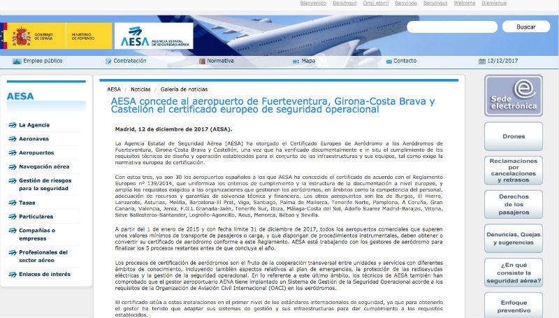 "La Agencia Estatal de Seguridad Aérea (AESA) ha otorgado el Certificado Europeo de Aeródromo a los Aeródromos de Fuerteventura, Girona-Costa Brava y Castellón, una vez que ha verificado documentalmente e in situ el cumplimiento de los requisitos técnicos de diseño y operación establecidos para el conjunto de las infraestructuras y sus equipos, tal como exige la normativa europea de certificación.