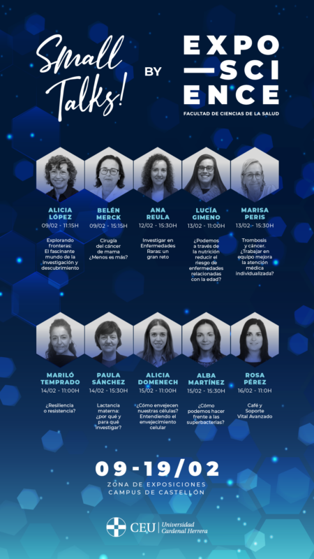 El CEU de Castellón dedica la cuarta edición de ExpoScience Salud a visibilizar el trabajo de las profesoras investigadoras del área de Ciencias de la Salud en la CEU UCH. Desde mañana y hasta el próximo viernes, los estudiantes podrán disfrutar de 'small talks', unas charlas cercanas y divulgativas en las que estas científicas explicarán algunos de sus proyectos de investigación. Protagonizarán estos encuentros Alicia López Castellano, Belén Merck Navarro, Ana Reula Martín, Lucía Gimeno Mallench, Marisa Peris Sifre, María Dolores Temprado Albalat, Paula Sánchez Thevenet, Alicia Doménech Bendaña, Alba Martínez Albiñana y Rosa Pérez Ibáñez. Las investigadoras de la CEU UCH presentarán a los futuros sanitarios los últimos resultados de sus trabajos en áreas como el cáncer de mama, las enfermedades raras, la nutrición en la prevención de enfermedades relacionadas con la edad, la labor de los equipos multidisciplinares en el abordaje de la trombosis y el cáncer, la resiliencia, la lactancia materna, el envejecimiento celular, las superbacterias o el soporte vital avanzado.
