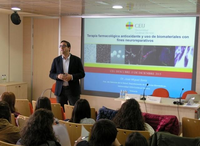 El profesor José Miguel Soria, miembro del Instituto de Ciencias Biomédicas de la CEU-UCH y director de la línea de investigación sobre Mecanismos neurorreparativos y de neuroprotección de esta Universidad, ha presentado en la sesión del ciclo de divulgación científica CEU Descubre, celebrada en el CEU de Castellón, las últimas terapias combinadas desarrolladas por su equipo en el campo de la neurorreparacion.