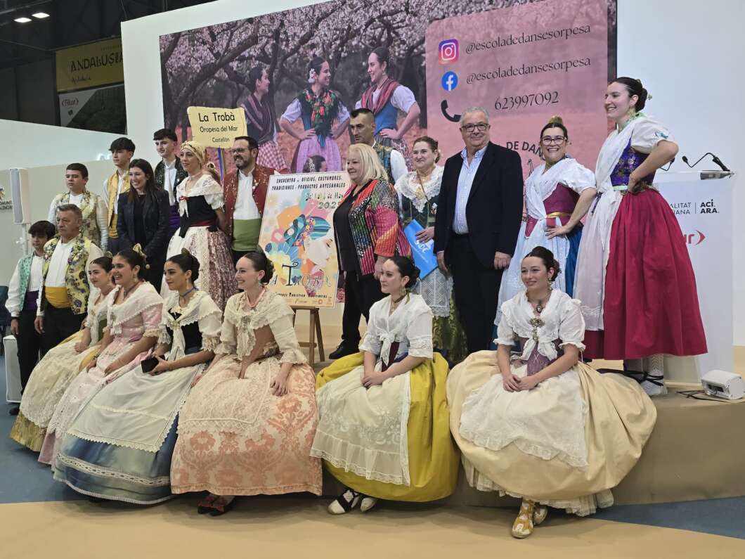 Además de esta campaña “contando los días”, los visitantes de Fitur han podido presenciar el showcooking a cargo de la Asociación de Hostelería de Oropesa, que ha repartido raciones de caldereta entre los asistentes. Por la tarde, a las 17:00h en la Plaza Central del stand de la Comunidad Valenciana, se ha presentado el cartel del encuentro de oficios y artesanía “La Trobà d’Orpesa 2025”, que se celebrará del 1 al 4 de mayo y que está declarada Fiesta de Interés Turístico Provincial. Este evento presentado por la alcaldesa de Oropesa, Araceli De Moya, junto al presidente de la Sociedad Orpesina de Cultura (SOC), Juan Carlos Aparici, ha contado con la colaboración de la “Colla de Dolçainers i Tabaleters L’Embolic d’Orpesa” y la Escola de Danses Orpesa, que además han presentado la indumentaria típica de la zona y han ofrecido una muestra de varios bailes regionales.