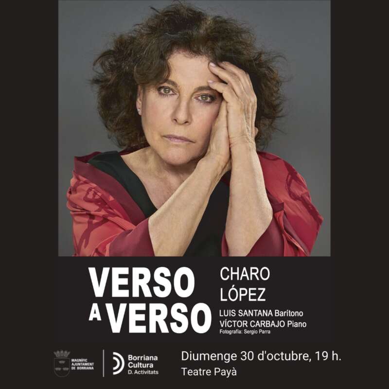 Aquest diumenge 30 d'octubre, l'Ajuntament de Borriana ofereix l'oportunitat d'assistir a l'espectacle 'Verso a Verso' de la mà de la gran actriu Charo López. L'espectacle previst a les 19h en el Teatre Payà convida a fer un lapse en aquests temps de vertigen i deixar un breu espai de temps per a la música i la poesia.
