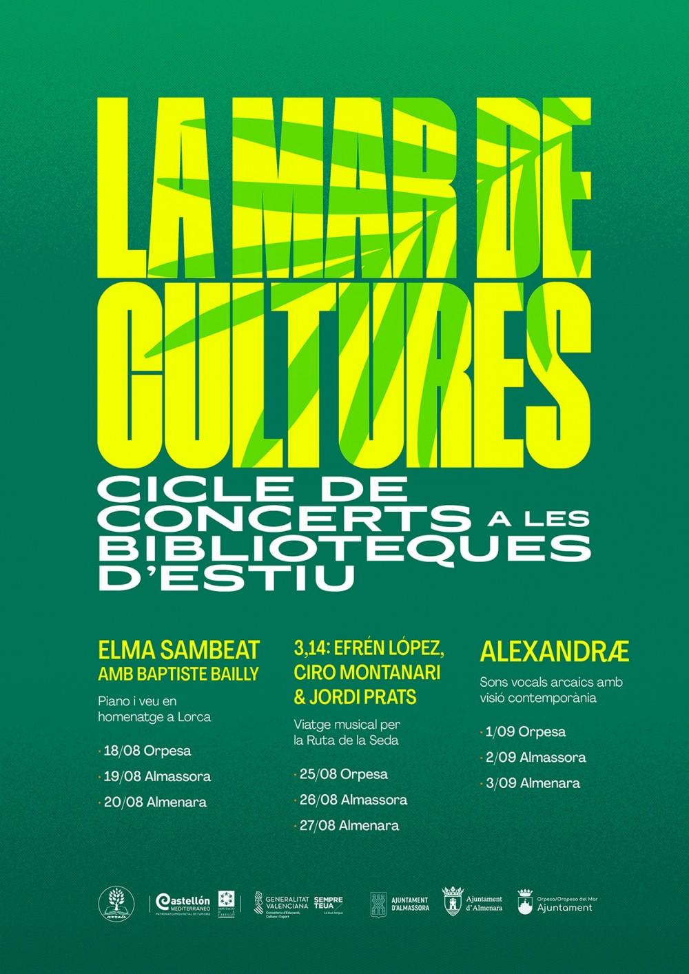 La Biblioteca de la Platja Casablanca d'Almenara, situada en el Centre Social Miguel Hernández del nucli marítim acollirà segona edició del cicle musical 'la Mar de Cultures' impulsat des de l'Associació Cultural i Medi Ambiental Arrels i la col·laboració del Patronat de Turisme de la Diputació de Castelló i dels ajuntaments d'Almenara, Orpesa i Almassora. El cicle presenta tres concerts de música mediterrània en xicotet format en els espais destinats a la lectura a les platges de les tres localitats. En el cas d'Almenara seran els divendres 20 i 27 d'agost i 3 de setembre a les 20 hores. L'accés als concerts serà lliure fins a completar l'aforament. En ells es compliran totes les normes sanitàries vigents.