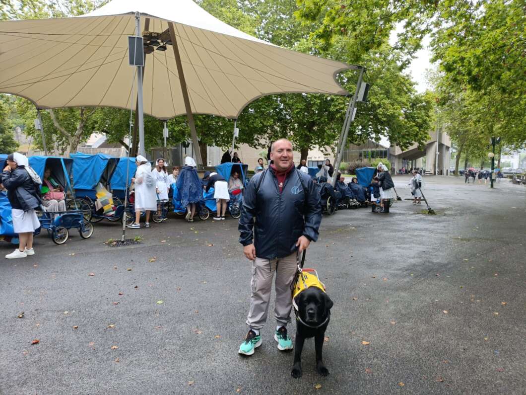 Lo mismo sucedió en Lourdes, un perro guía fue la mayor novedad de todos cuantos se concentraron. Y también allí, desde el obispo, hasta los compañeros de expedición y los integrantes de otras diócesis quedaban entusiasmados con el comportamiento del perro guía y solicitaban permiso a Vicente para acercarse y proporcionarle unas caricias.