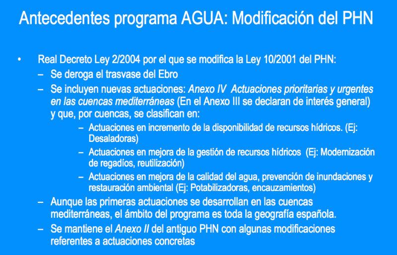 En su lugar, el Gobierno Zapatero aprobó su programa estrella denominado Agua, en el que se planteaban, entre otras medidas, la construcción de desaladoras para luchar contra la sequia en la Comunitat Valenciana. Dos de ellas, las ubicadas en Oropesa, con extensión hasta Benicassim; y la de Moncófar- Xilxes. La empresa gubernamental creada para la coordinación de estos proyectos fue Acuamed.