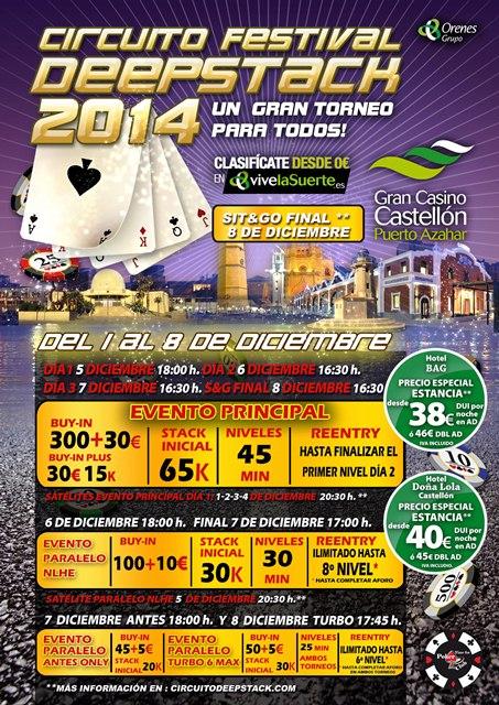 La última etapa del Circuito Festival DeepStack, que se celebrará del 1 al 8 de diciembre, trae novedades con respecto al resto de etapas anteriores. Para empezar, como ya se contó en el inicio de este Circuito, tiene un buy in de 300+30€, y cuenta con un solo día 1, el 5 de diciembre a las 18:00h, puntuando el doble que el resto de etapas. Esto nos deja la celebración de los Torneos Satélites al Evento Principal del lunes 1 al jueves 4 de diciembre, con un buy in de 20€, con rebuy y add-on de 20€ y doble rebuy / add-on de 30€. Además, los jugadores también podrán optar a conseguir plaza, previamente, desde 0€ en vivelaSuerte.es cada domingo a las 18h o el último domingo de este mes de noviembre a las 20:00h con 3 plazas GTD.