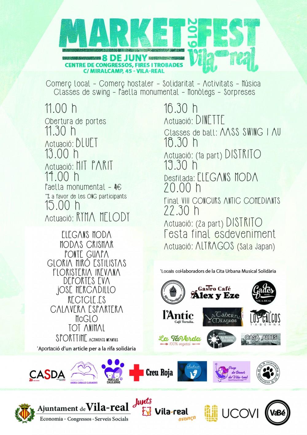 El Market Fest se celebrarà durant tot el dia, des de les 11.00 hores fins a les 22.30 hores, amb un final de festa a la Sala Japan. Al llarg de la jornada, hi haurà actuacions musicals, balls, el Concurs de monòlegs de l’Antic, una desfilada i la presència també del comerç local i hostaler que ha pres part en la campanya. “Convidem a tots a què vinguen el dissabte a una festa en la qual podran ballar, comprar, menjar i beure, escoltar bona música i donar suport a les diferents iniciatives solidàries”, afegeix Simó, qui recorda que es pot accedir al Centre de Congressos amb l’autobús públic gratuït, amb informació al detall de parades i localització des de l’app Vila-real.