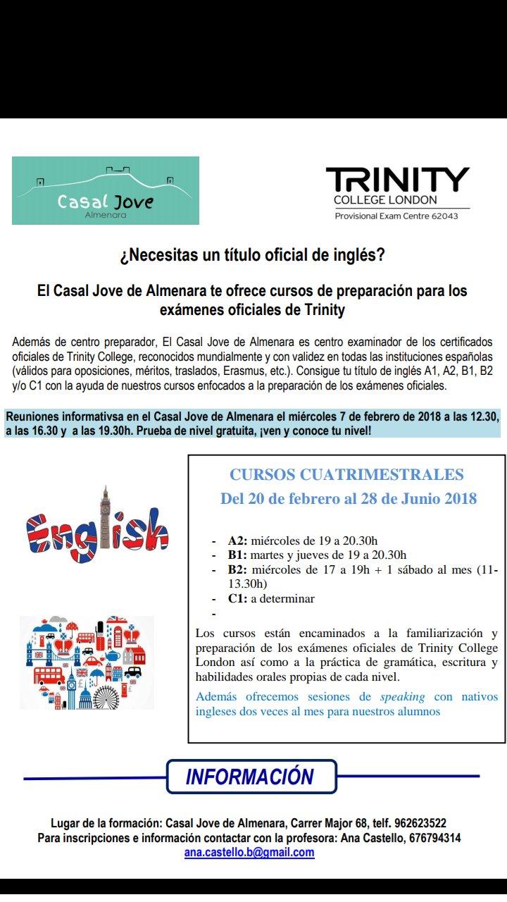 El dimecres 7 de febrer en el Casal Jove d'Almenara s'han programat tres sessions informatives, amb les seues corresponents proves de nivell gratuïtes, per a donar a conèixer les novetats del segon quadrimestre dels cursos d'anglès del Trinity College London dels quals el Casal Jove és Centre Examinador Oficial, la qual cosa significa que tant les classes com els exàmens es realitzen en les seues instal·lacions sense que els alumnes hagen de desplaçar-se del municipi.