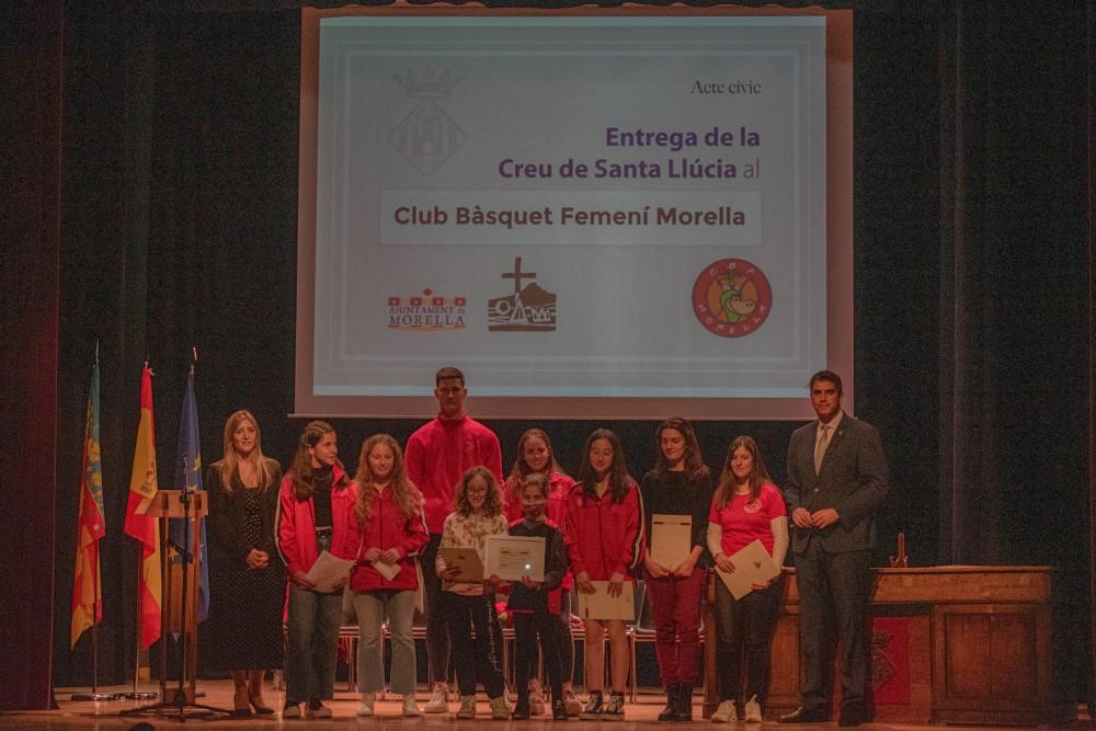 Morella ha entregat avui la Creu de Santa Llúcia, màxima distinció de la ciutat, al Club de Bàsquet Femení Morella en un acte celebrat al Teatre Municipal. Així, i com es va aprovar al ple extraordinari celebrat el 3 de gener, aquesta és una entitat que va més enllà de l’activitat esportiva, ja que es tracta de l’únic club femení en esport d’equip i, per tant, el que dóna instruments a les xiquetes per empoderar-se, fer-se fortes, independents i comprovar que elles també són capaces i poden ser les protagonistes de les grans gestes esportives com han demostrat en tots aquestos anys.