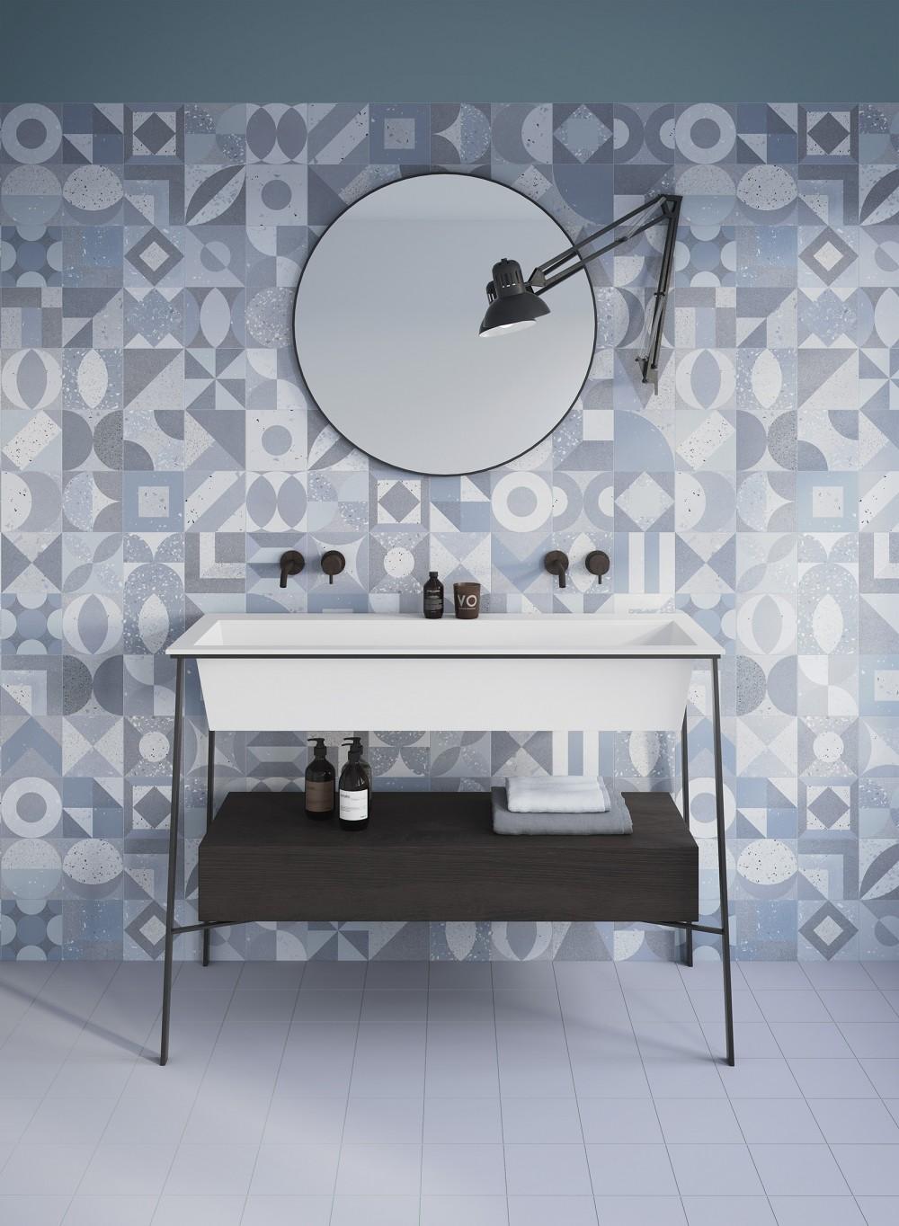 La serie Fusion añade un toque decorativo animado basado en un look geométrico donde destacan las cualidades de los materiales que lo componen, como el jesmonite y el terrazo, mezclados con cementos más tranquilos.