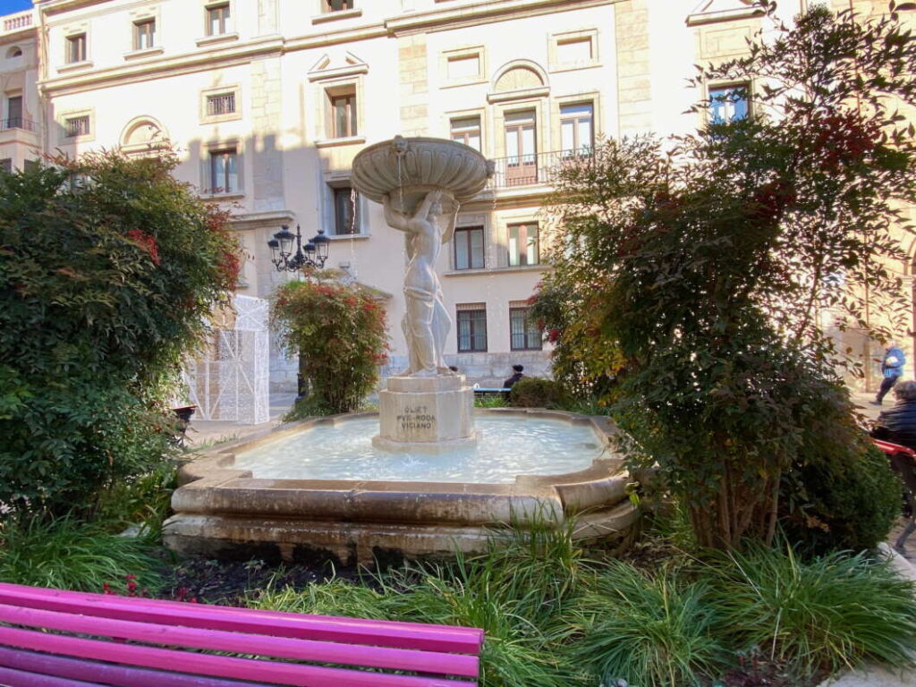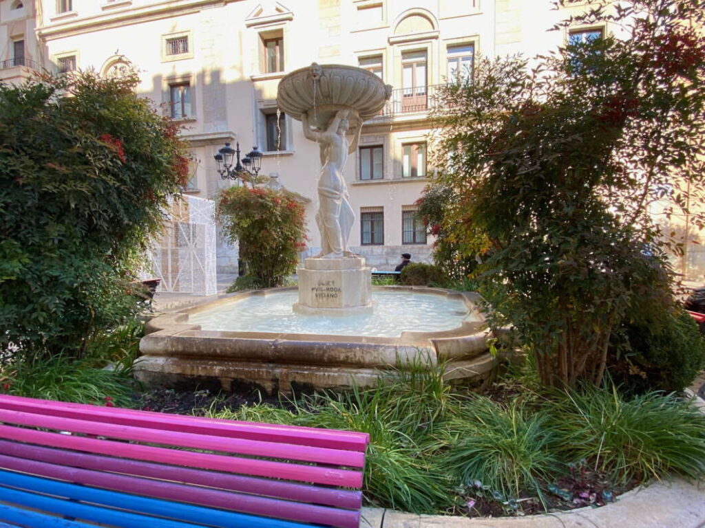 El olor a porro procede de una de las plantas del parterre ajardinado que rodea la ‘estatua de los artistas’, que representa a dos ninfas semidesnudas que sostienen sobre sus cabezas una gran pila decorada con cuatro cabezas que escupen agua.