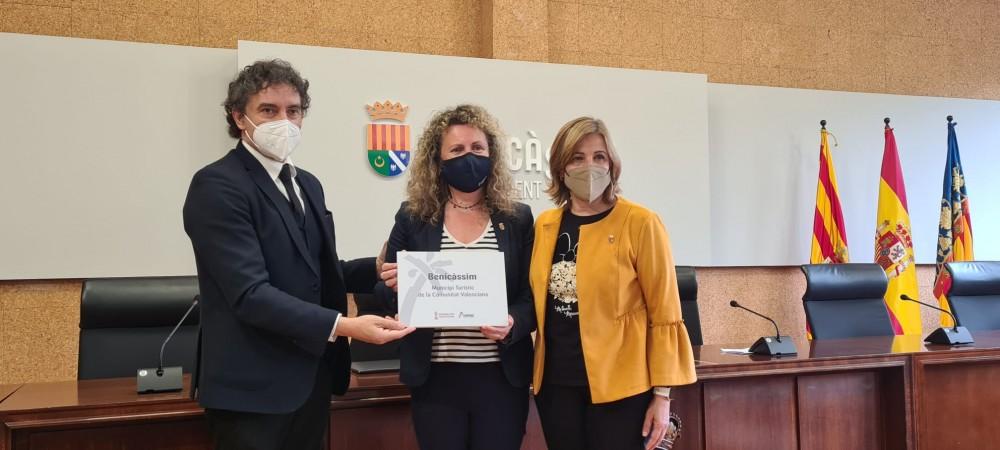 El secretario autonómico de Turisme, Francesc Colomer, ha entregado a la alcaldesa de Benicàssim, Susana Marqués, y la concejala de Turismo, Cristina Fernández, el distintivo que acredita al destino la condición de Municipio Turístico de la Comunitat Valenciana, tras su publicación oficial este lunes en el Diario Oficial de la Generalitat Valenciana