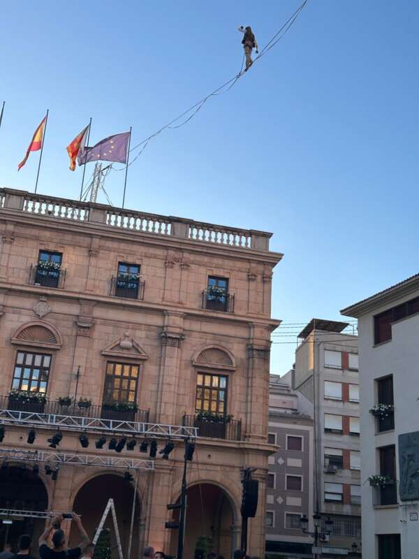 Y el resultado ha sido emocionante, el público casi no podía creerlo cuando el artista ha comenzado a realizar su camino sobre un cable que enlazaba la azotea del Ayuntamiento con el Fadrí, y con la concatedral de Santa María.