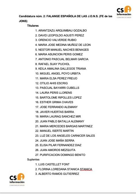 2: Falange Española De Las J.O.N.S. (FE De Las JONS), liderada por: Arantzazu Arquimbau Gozalbo.