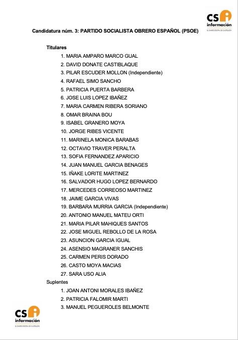 3: Partido Socialista Obrero Español, liderada por Maria Amparo Marco Gual.