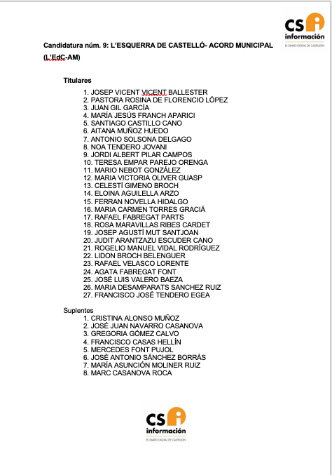 9: L’esquerra De Castelló- Acord Municipal (L’EdC-AM), liderado por Josep Vicent Vicent Ballester.