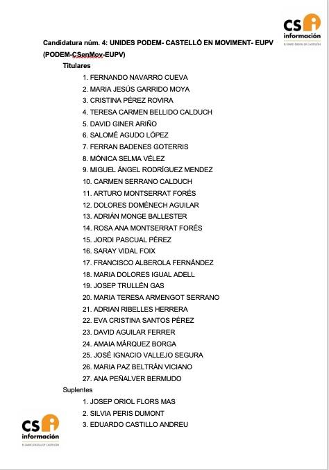 4: Unides Podem- Castelló En Moviment- EUPV (Podem-CSenMov-EUPV), liderada por: Fernando Navarro Cueva