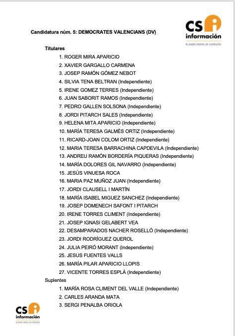 5: Democrates Valencians (DV), liderada por Roger Mira Aparicio.