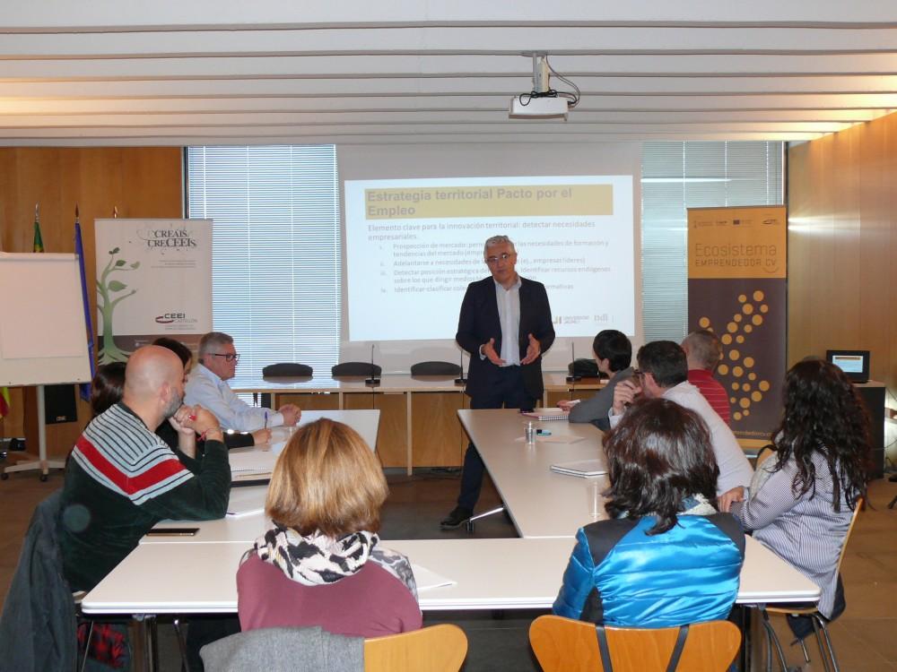 CEEI Castellón ha acogido hoy lunes el taller 'Cómo y en qué áreas innovar en el territorio', en el marco de los Itinerarios para el emprendimiento y el desarrollo del territorio para Agentes Ecosistema Emprendedor CV. Bajo el impulso de los CEEI de la Comunitat Valenciana y el grupo de Investigación del Instituto Interuniversitario de Desarrollo Local, en el que participa la Universitat Jaume I, el encuentro ha contado con la participación de entidades y agentes del ecosistema emprendedor de las comarcas castellonenses. El objetivo es sentar las bases para fortalecer el desarrollo del territorio, mediante la implementación de itinerarios para el desarrollo del emprendimiento y la creación de empresas que supongan nuevos procesos de innovación territorial.