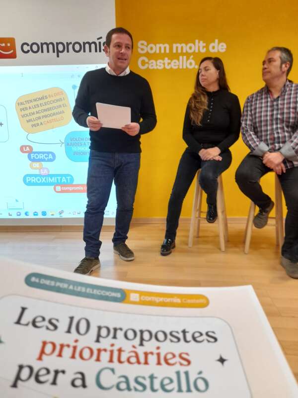 La formación abrirá el formulario el martes 21 de marzo para que la ciudadanía pueda escoger entre las propuestas sacadas a partir del trabajo hecho tanto por parte de las sectoriales de Compromís, como también las propuestas que trasladan las vecinas y vecinos en los encuentros de 'Castelló, Pam a Pam', que inició Compromís en enero con la intención de recorrer las calles de Castelló escuchando y tomando nota de las necesidades del vecindario, y que sigue a pleno rendimiento. Este formulario permanecerá abierto durante una semana aproximadamente, según han informado desde la formación política.