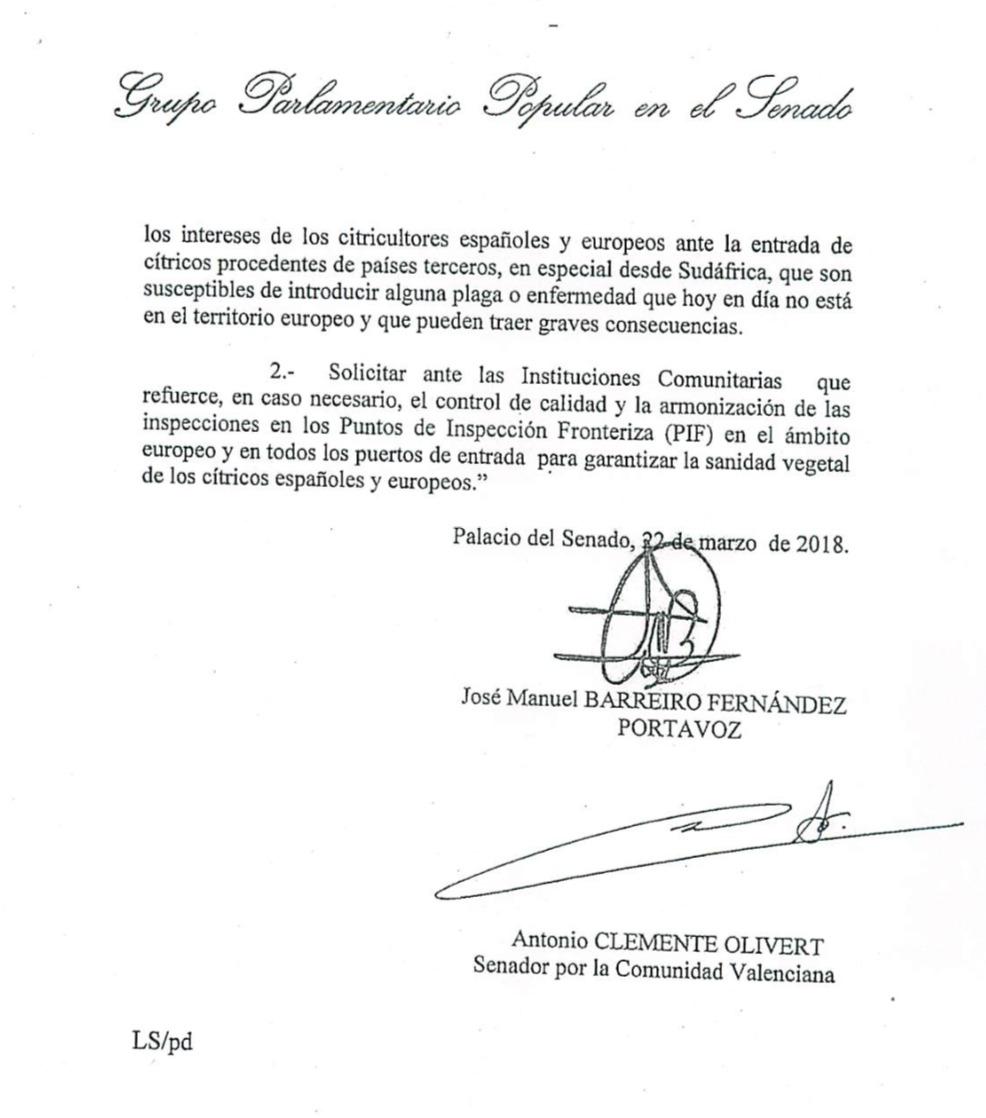 Els senadors de Compromís ja van reclamar al juny de l'any passat la dimissió del secretari general d'Agricultura i Alimentació, Carlos Cabanas, per la manca d'implicació del seu departament a l'hora d'intensificar els controls en fronteres per frenar l'arribada de malalties que puguen afectar greument una economia tan basada en la citricultura i l'olivar com és la valenciana i espanyola. Inspectors de la Comissió Europea també van certificar que, de forma irresponsable, tant Galícia com Portugal es resignen a renunciar a l'eradicació i es limiten a tractar de contenir l'expansió de l'insecte Trioza erytreae, la psila africana, que actua com a vector portador de la més temuda malaltia dels cítrics, coneguda com Huangglongbing (HLB) o Greening.