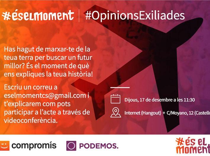 "Necessitem un canvi perquè Castelló, al País Valencià, siga una terra d'oportunitats. Perquè la nostra gent tinga un futur aquí i no es vegi obligada a marxar. I per a això l'acció política que es faci a Madrid és fonamental. S'ha de recuperar el camí de la investigació, del suport als emprenedors, als joves ... És el moment de canviar i d'apostar per un futur ". Així ho ha manifestat el cap de llista al Congrés de Compromís-Podem, Marta Sorlí, que demà dijous, a les 11.30 hores, donarà la veu als "castellonencs exiliats". Per a això, la candidatura d'És el Moment ha organitzat per demà 'Opinions Exiliades' una acció de campanya d'allò més internacional en què participaran castellonencs exiliats a totes les parts del món a través d'una videoconferència en grup. "Volem sentir els seus testimonis, perquè són la nostra gent. La gent que ha marxat per falta d'il·lusió, d'oportunitats o, simplement per trobar una vida millor que aci no se'ls oferia ". Des d'Alemanya, des d'Austràlia, des d'Holanda, Compromís-Podem "donarà veu als que des de la distància tenen dificultats per fer-se escoltar".