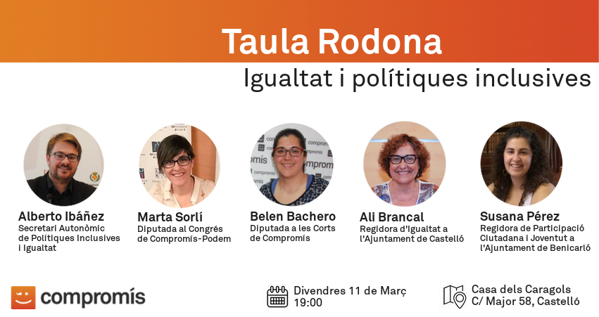 El portaveu de Compromís per Castelló ha anunciat que “aquest divendres 11, a les 19 hores, a la Casa dels Caragols de Castelló de la Plana (C/Major, 58), Compromís realitzarà una taula rodona sobre igualtat i polítiques inclusives.”