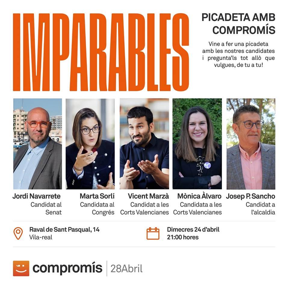 Compromís continua amb la seua campanya 'Imparables' per a les eleccions del pròxim diumenge 28 d'abril, en les quals es decideix el futur del Govern central i de l'autonòmic, a les quals es presenta amb diferents candidats que estaran, una vegada més, a Vila-real, per a explicar el seu programa de govern i atendre a totes les persones que ho desitgen i donar respostes a totes les seues preguntes 'de tu a tu'.
