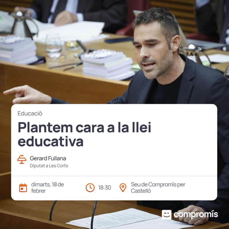 Així, la coalició ha convocat una trobada oberta amb Gerard Fullana, diputat autonòmic i responsable d'educació en Les Corts, dimarts que ve 18 de febrer, a les 18.30h, en la seua seu a Castelló, al carrer Navarrés, número 1; per parlar de com Compromís està actuant per plantar cara a aquesta llei i defensar el dret a aprendre i créixer en valencià.
