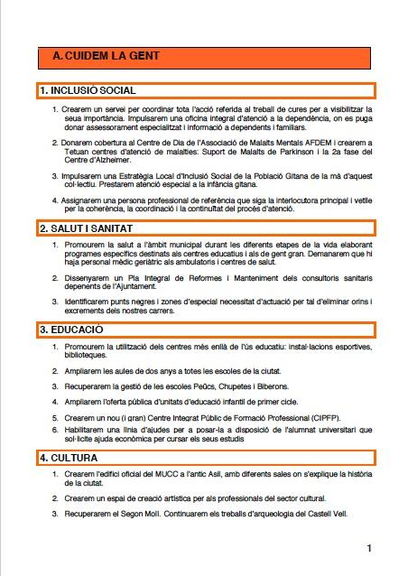 L'edil ha destacat que "aquest programa està fet basant-se en l'Acord del Grau com a full de ruta, per continuar amb les polítiques valentes, d'esquerres que hem treballat durant aquests 4 anys". A més, Garcia ha explicat que "en l'elaboració del programa també han col·laborat les sectorials del partit formades per professionals, militants i regidors, i per les propostes obtingudes de les reunions amb les associacions, col·lectius i la gent de la societat civil de la ciutat".