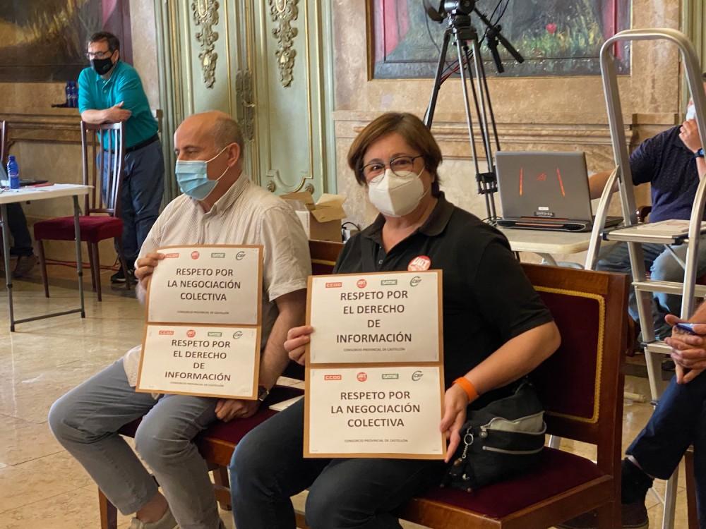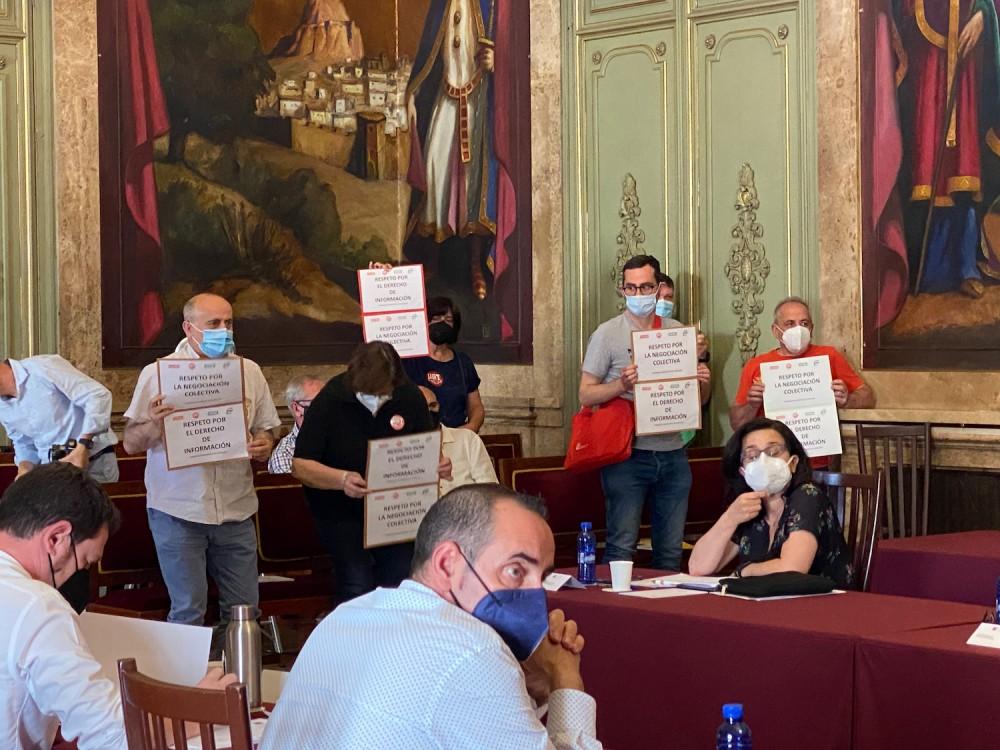 La protesta se trasladaba después al salón de plenos, donde los representantes sindicales también siguieron la sesión y mostraron sus pancartas en contra de este decreto.