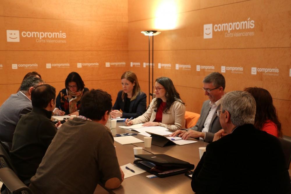 La candidata de Compromís a la Presidencia de la Generalitat, Mónica Oltra, el candidato por Alicante a Les Corts, Rafa Climent y las candidatas por Valencia al Congreso, Isaura Navarro y Clara Ferrando, han mantenido esta mañana una reunión de trabajo con representantes de la Federación de Autónomos de la CV, la Confederación de Cooperativas de la CV y la Federación de Polígonos Empresariales de la CV.