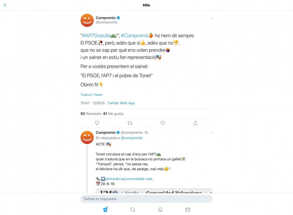 Compromís ha presentat el sainet 'El PSOE, l'AP7 i el pobre Tonet' a les seues xarxes socials per a evidenciar els estira i arronsa que estan mantenint el PSPV i el PSOE sobre l'alliberament de l'AP7 que s'haurà de produir l'1 de gener de 2020.