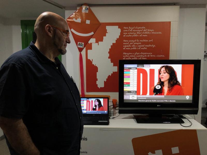 Caras serias y largas en la sede de Compromís de Castellón, en la noche electoral del 28A.