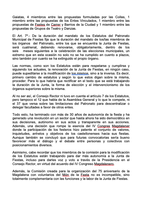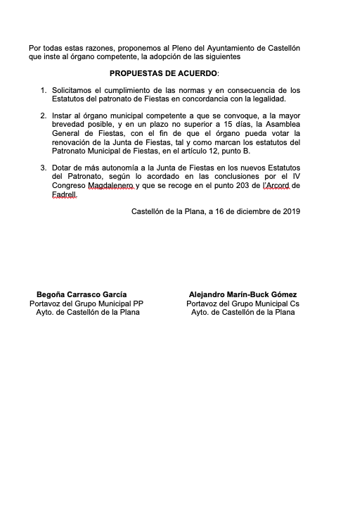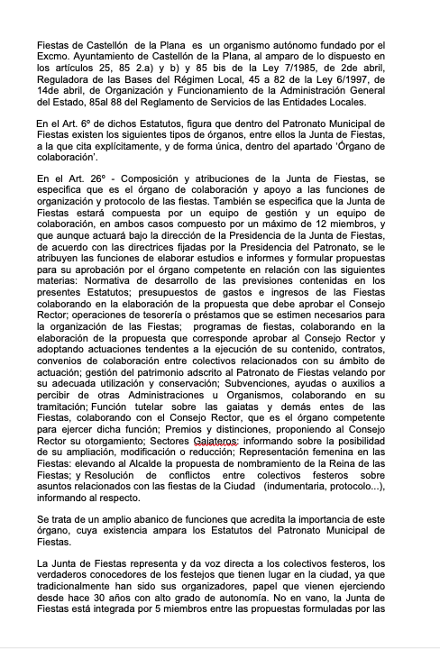 “1.- Solicitamos el cumplimiento de las normas y en consecuencia de los Estatutos del Patronato de Fiestas en concordancia con la legalidad.