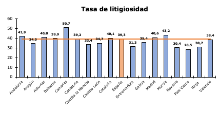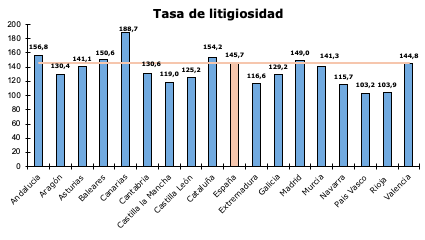 La tasa de litigiosidad en el conjunto de España en 2023 fue de 145,7 asuntos por cada 1.000 habitantes, mientras que la de la Comunidad Valenciana fue de 144,8, lo que la sitúa en la sexta posición del país. Las Comunidades Autónomas que mostraron una tasa de litigiosidad superior a la nacional fueron Canarias (188,7), Andalucía (156,8), Cataluña (154,2), Baleares (150,6) y Madrid (149). Los territorios con la tasa de litigiosidad más baja fueron País Vasco (103,2), La Rioja (103,9) y Navarra (115,7) (*).