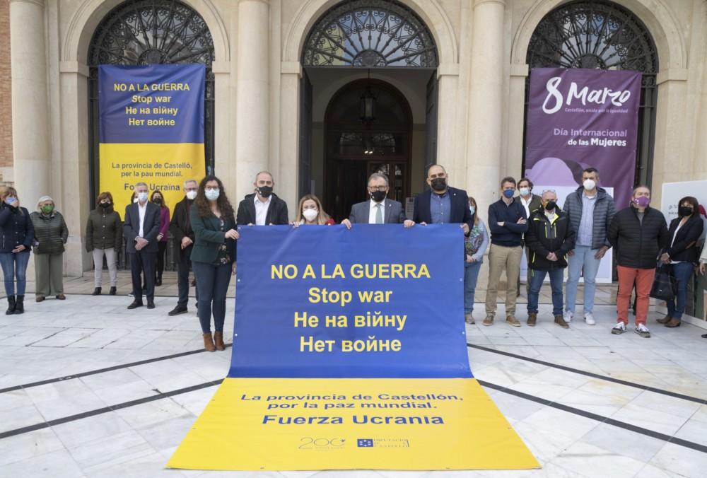 La Federación Valenciana de Municipios y Provincias ha organizado hoy una concentración silenciosa para mostrar el rechazo a la agresión de Rusia a Ucrania y la solidaridad con los ucranianos y las víctimas de la guerra. A este acto se han sumado diferentes municipios de toda la provincia de Castellón, además de la Diputación.