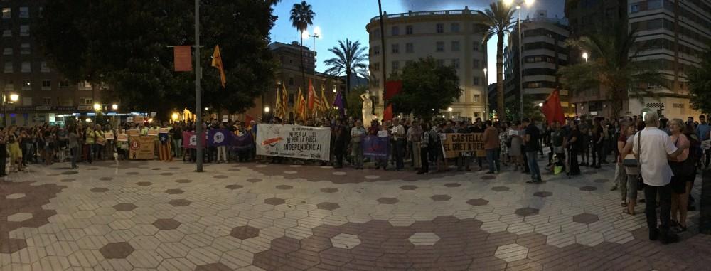 En torno a 250 personas se han concentrado esta tarde noche en la plaza Mª Agustina de Castellón, delante de la Delegación del Gobierno para protestar por las medidas adoptadas por el Gobierno, para paralizar los intentos del Gobierno de Cataluña para celebrar el referéndum de independencia del próximo 1 de octubre.