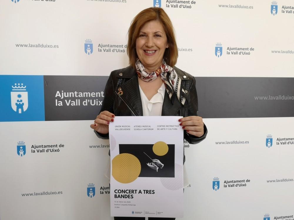 La Concejalía de Cultura del Ayuntamiento de la Vall d'Uixó presenta la segunda edición del Concert A Tres Bandes, protagonizado por la Unión Musical Valldeuxense, el Ateneo Musical Schola Cantorum y el Centro Instructivo de Arte y Cultura (CIAC). El acto tendrá lugar el sábado 15 de febrero, a las 19.00 horas, en el Auditorio Leopoldo Penyarroja. Las entradas al concierto son gratuitas y se pueden conseguir en la web www.auditoriolavallduixo.es o mañana, jueves 13 de febrero, en la taquilla del Auditorio Leopoldo Penyarroja.