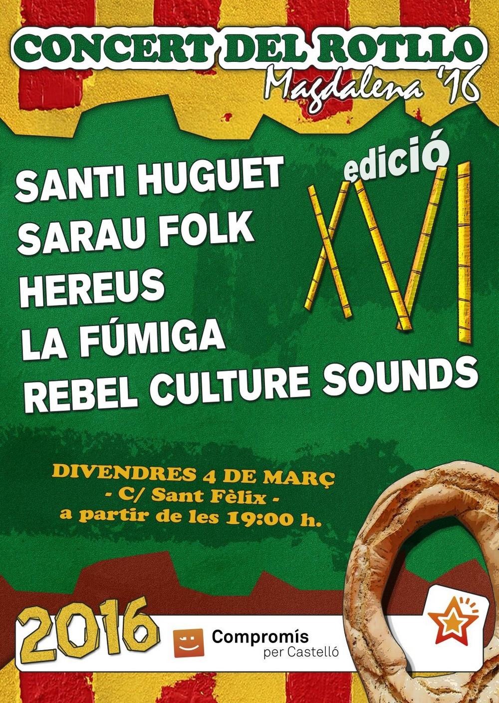 El proper divendres 4 de març se celebrarà el concert de Magdalena que organitzen els i les joves de Compromís per Castelló. concert magdalena compromisD'aquesta manera s'arriba a la XVI edició d'un esdeveniment que ja s'ha convertit en un referent en el calendari de les festes de la ciutat, fins 2014 sota el nom de «BLOC ROCK» i l'any passat com a «Concert Magdalena Compromís». Enguany el concert es reinventa amb el nom de «Concert del Rotllo» i oferirà un cartell musical variat des de les 7 de la vesprada fins la matinada. Com és habitual, les actuacions són gratuïtes i tindran lloc al carrer Sant Fèlix.