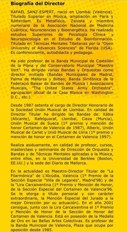 De él se cuentan muchas cosas, aunque lo mejor es la biografía que recoge en su web la Banda Municipal de Música de Bilbao. En ella, habla del director como músico nacido en Llombai (Valencia), titulado superior de Música, ampliación en Paris y Rótterdam”. Curiosamente no se cita si tiene el título de dirección de orquesta, pero si se exaltan otras titulaciones como: “Es Metafísico, Zenista y miembro numerario de la Asociación Nacional de Medicina Cuántica, Neurociencias y Bioenergética. Ha realizado estudios Superiores de Psicología Clínica y Neuropsicología en el Estudio de Bioinformación. Titulado en Técnicas Mentales Tibetanas por la "Open University of Advances Sciencies" de Florida (USA). Es conferenciante, autodidacta y pedagogo.”