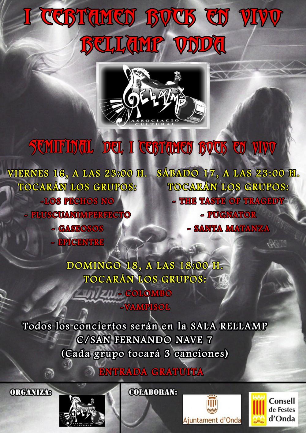 9 grupos locales participarán en la semifinal de este concurso, que se celebrará en la Sala Rellamp, ubicada en la calle San Fernando, Nave 7, durante el fin de semana. Hoy, a las 23.00 horas, actuarán 'Los pechos no', 'Pluscuanimperfecto', 'Gaseosos' y 'Epicentre'. El sábado 17, también a las 23.00 horas, lo harán los grupos 'The Taste Of Tragedy', 'Pugnator' y 'Santa Matanza'. Por último, el domingo 18, a partir de las 18.00 horas, será el turno de 'Colombo' y 'Vampisol'. Durante estas sesiones musicales gratuitas, cada grupo tocará tres canciones y un jurado formado por un miembro de la asociación Rellamp, uno del Consell de Festes y un músico profesional, seleccionará a las 3 formaciones que pasarán a la final, que tendrá lugar el próximo viernes 23 de septiembre, a las 22.30 horas, en el Raval de Sant Josep, en una actuación incluida en la programación de la Fira de Sant Miquel.