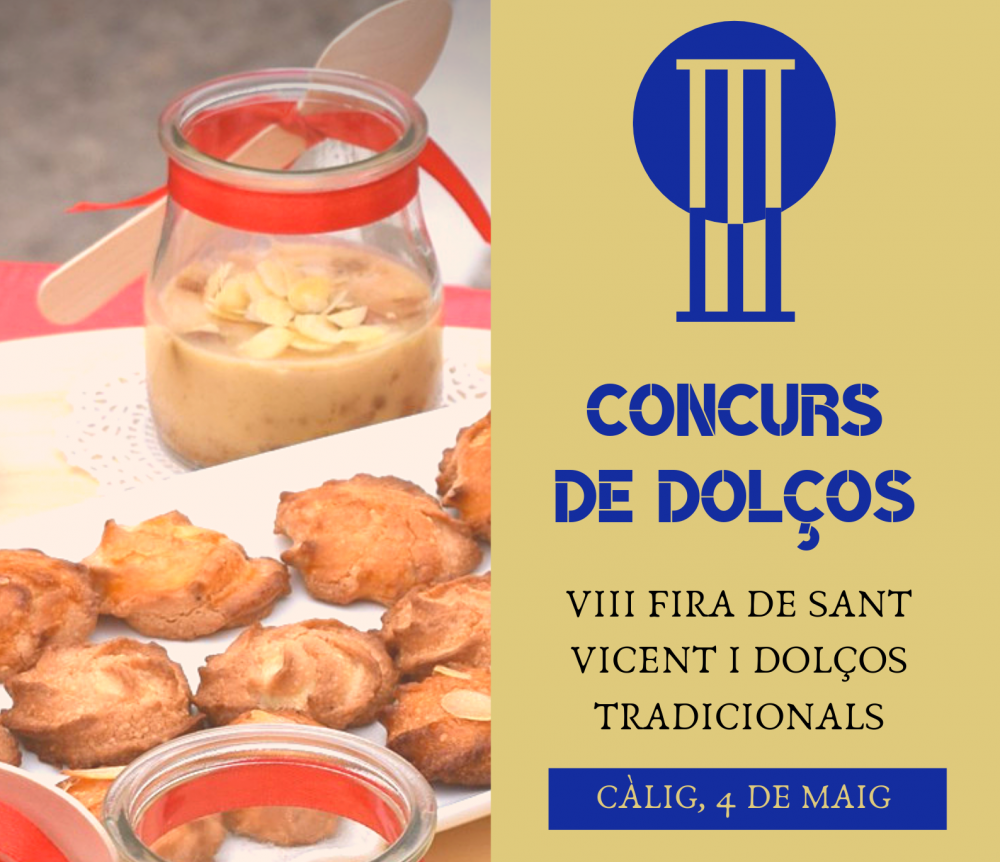 L’Ajuntament de Càlig, a través de la Regidoria de Cultura, Educació i Benestar Social ha convocat el III Concurs Popular de Dolços que es celebrarà durant la VIII Fira de Sant Vicent i dolços tradicionals, que tindrà lloc el dissabte 4 de maig a la plaça Nova. Els participants que desitgen inscriure’s en la prova, hauran de presentar una sol·licitud a l’Ajuntament fins el dia 30 d’abril, o bé a través del correu electrònic info@calig.es mitjançant petició dirigida a l’àrea de cultura. Cal que presenten també la fitxa tècnica dels dolços sense incloure cap nom ni dada de la persona que participa.